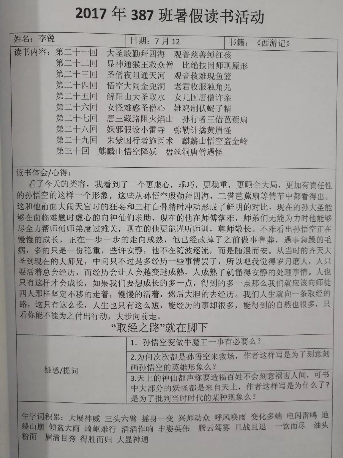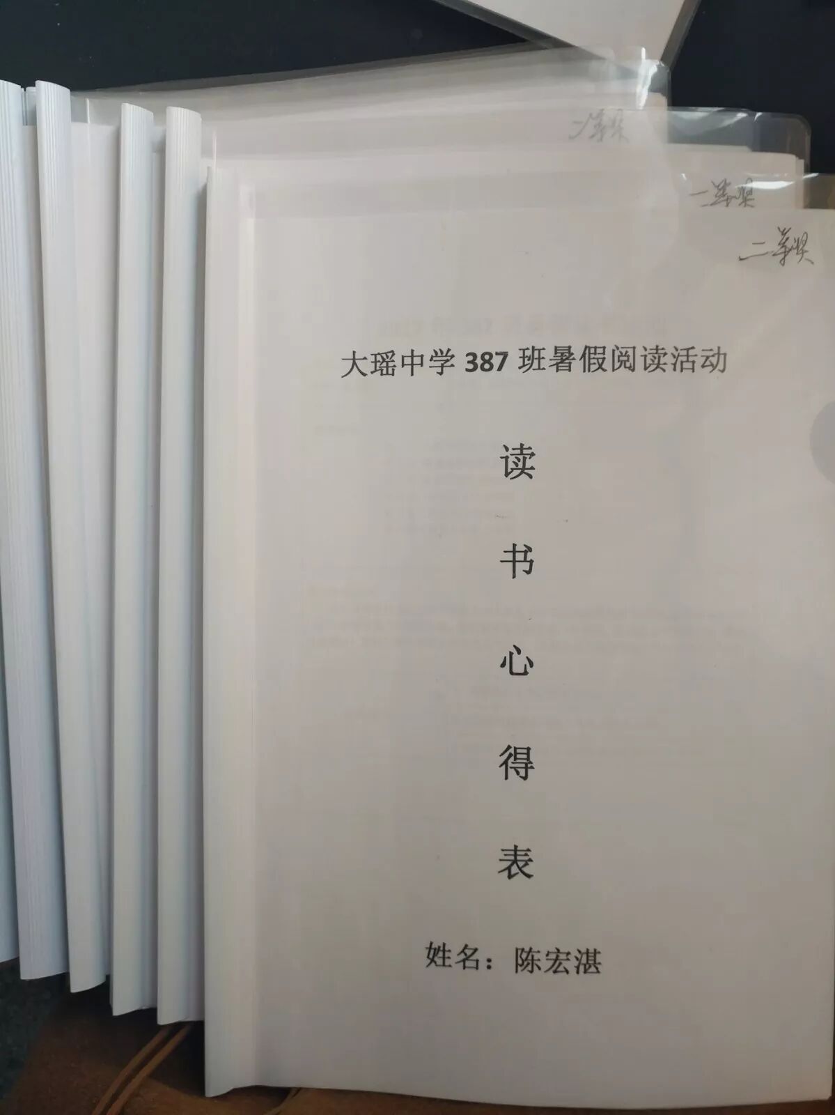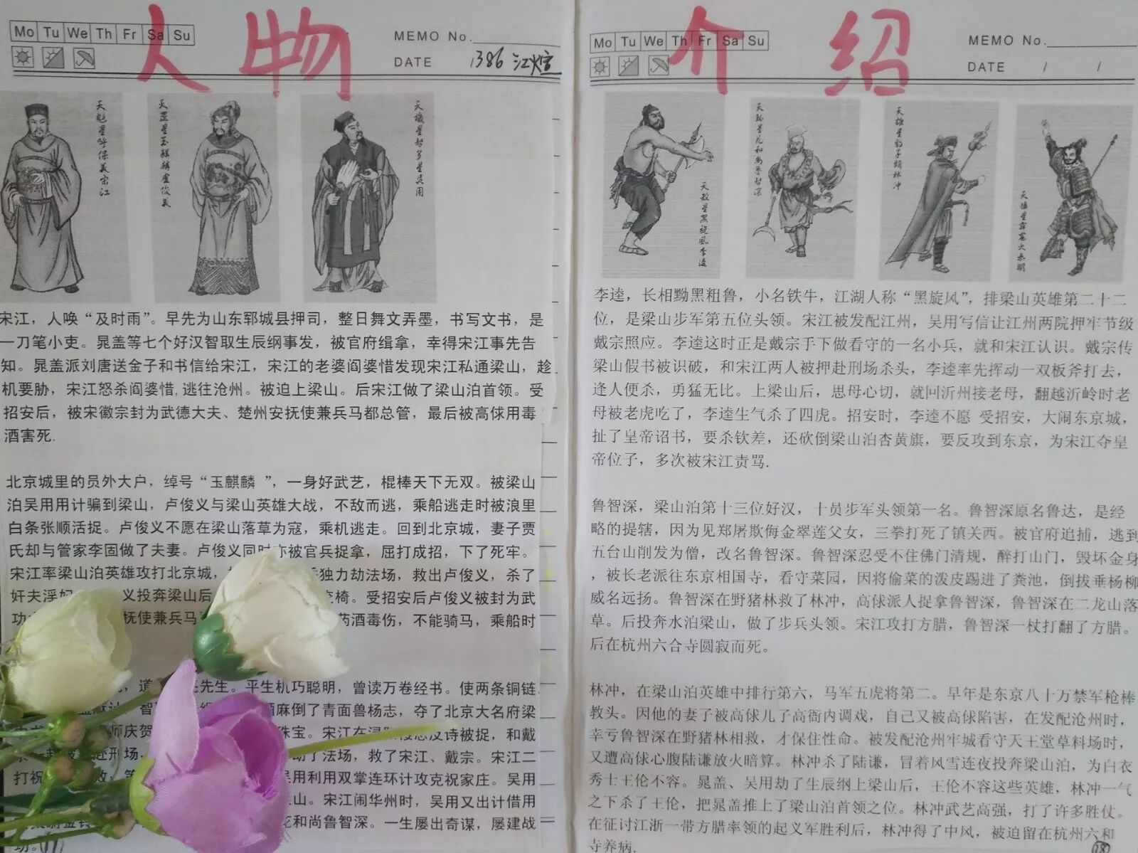 上学期末,同学们便接到了暑假读书任务卡,要求在暑假完成《水浒传》《西游记》《培根随笔》《傅雷家书》四本书的阅读,并要求做好详细的读书笔记,写好读书心得和一本字帖。到本期期初,收集暑假成果,成立学生评委团,由评委团制定评分细则并负责从720份读书笔记和读书心得中评选出优秀篇目。他们细心、公正的态度获得师生一致好评。