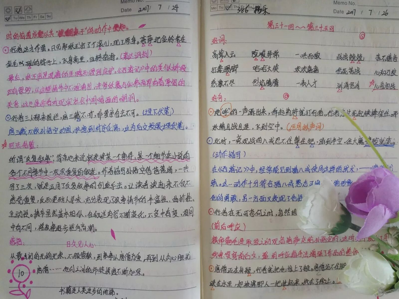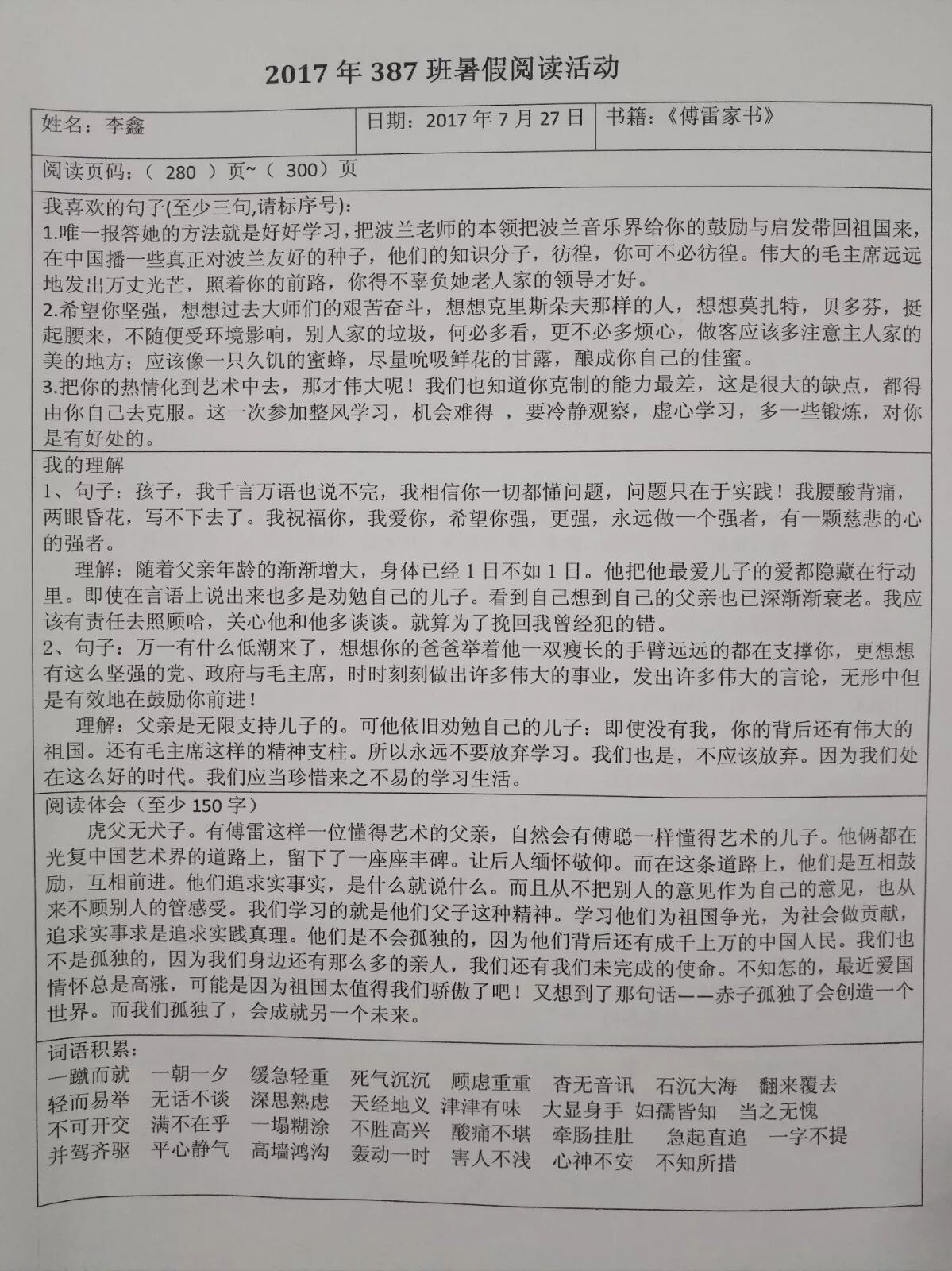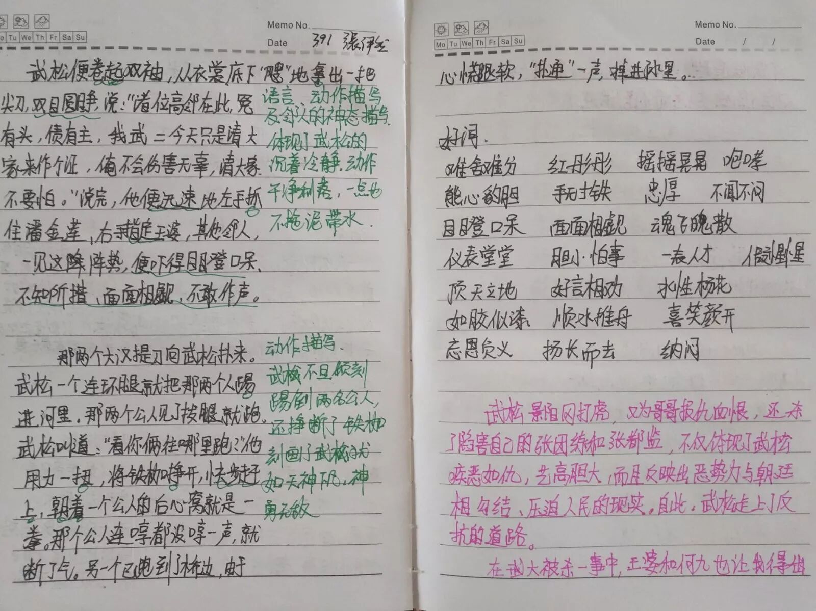 上学期末,同学们便接到了暑假读书任务卡,要求在暑假完成《水浒传》《西游记》《培根随笔》《傅雷家书》四本书的阅读,并要求做好详细的读书笔记,写好读书心得和一本字帖。到本期期初,收集暑假成果,成立学生评委团,由评委团制定评分细则并负责从720份读书笔记和读书心得中评选出优秀篇目。他们细心、公正的态度获得师生一致好评。