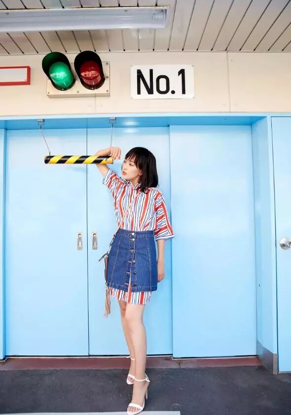 玄色及肩短发尽显调皮心爱,红蓝条纹衬衫裙颜色亮丽样式繁复,蓝色牛仔高腰裙包裹出曲线清楚的好身体。