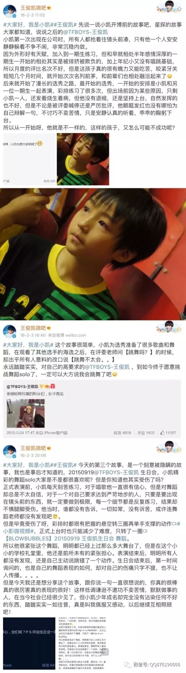 王俊凯今天五岁啦 TFB0YS一Karry加冕成王 内地男星 2017-02-03 14:11:24 588 创作不易,用心坚持,欢迎请BaGua喝几杯爱心咖啡!打赏并支持本文 打赏并删除本文 更多精彩内容 加TFBOYS王俊凯微信号QQ876196666关注小凯今天五岁啦 1p120203 2-3p140203 4p150203 5-6p160203 7-9p你有想说的话吗?点击箭头处阅读原文 创作不易,用心坚持,欢迎请BaGua喝几杯爱心咖啡!打赏并支持本文 打赏并删除本文 感谢您的支持鼓励,我会继续努力的!文章地址:用户邮箱:打赏金额:USDT 请输入数字点击”去打赏“,即可进行打赏支持本文章哦 王俊凯 About the Author TFB0YS一Karry加冕成王 功能介绍:认证: 人气少年偶像组合TFBOYS队长 王俊凯 Related Posts 王俊凯最帅照片,小螃蟹的大福利来咯,快领取! 2023-03-06 21:21:08 王俊凯:颜值天花板了属于是 2022-12-01 21:21:26 钟镇涛想念儿子王俊凯!没想到引出了一大波儿媳妇! 2018-04-03 17:20:18 王俊凯被央视采访 ,畅谈的成功之路 2017-12-26 06:00:29 王俊凯揭秘TF童年记忆!让人意外! 2017-12-25 20:12:59 发表评论