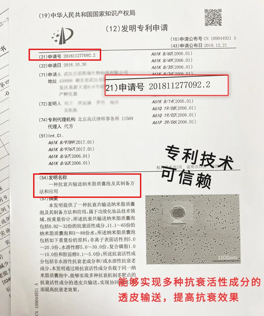 摒弃了打针的手术式风险,除皱颈纹贴用专利技术:纳米囊泡(专利申请号:201811277092.2)成功把多种抗衰精华浓缩进贴片中,有着长效抗衰的能力。