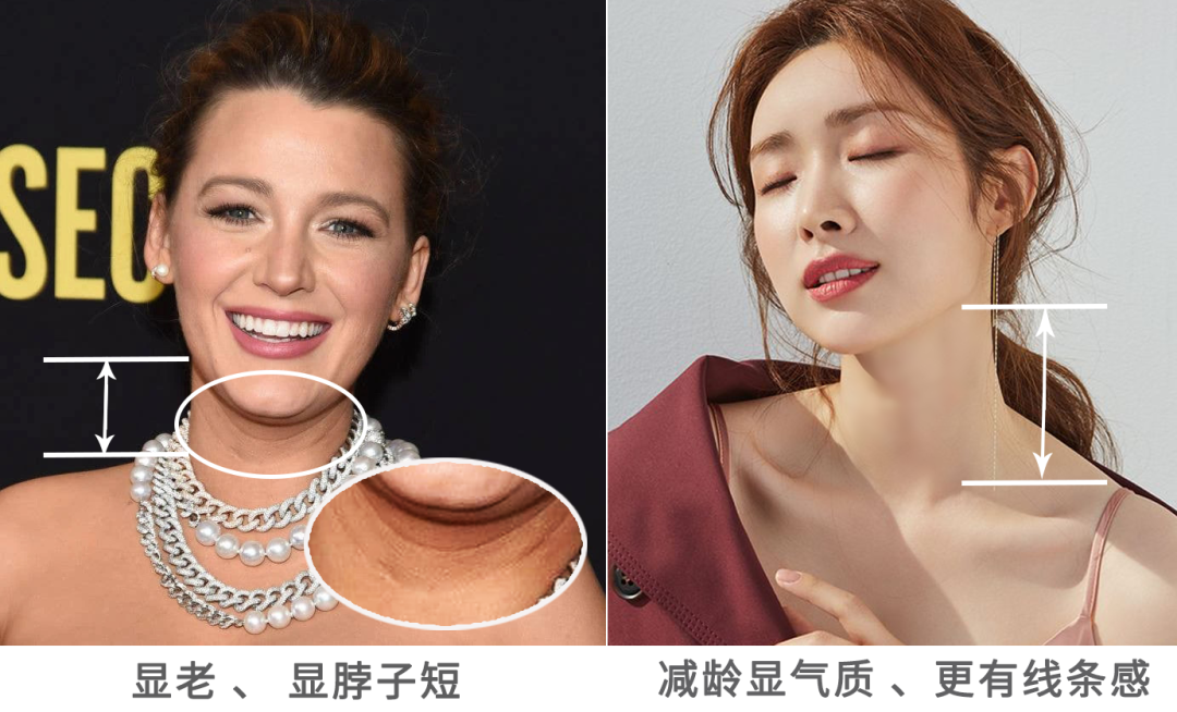 颈纹不止显老影响仪态气质,还会影响颈部的线条美感,在视觉上横向延伸,缩短脖子的长度。