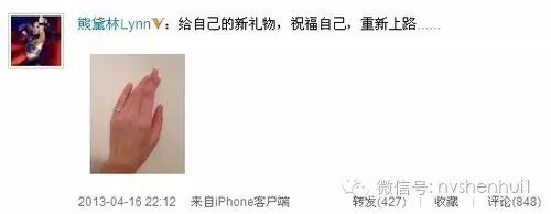 恋爱中合久不婚,那么肯定是必分了...2013年,33岁的熊黛林终于醒悟,苦等七年没有郭富城送的钻戒,熊黛林为自己戴上尾戒。