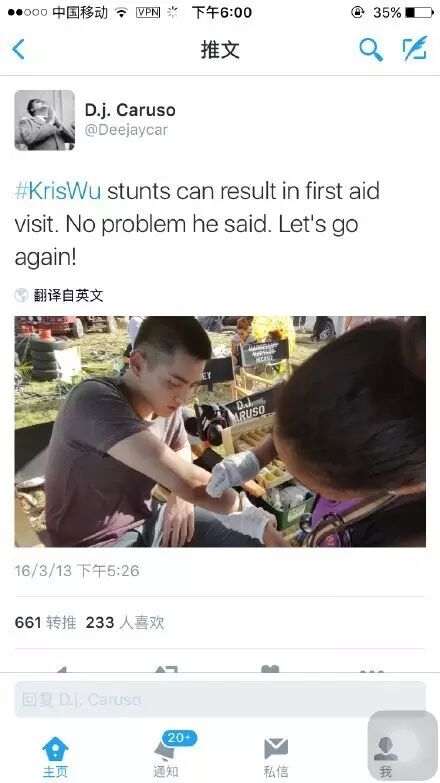 在地球的另一边,电影《极限特工3:终极回归》导演D·J·卡卢索在推特更新了吴亦凡拍戏的最新动态。他写道:“吴亦凡在进行特技动作时受伤,立马接受了急救。他说,没大碍。我们再来一遍吧!”能让导演点赞的,首当其冲是一个演员的自我修养。一张处理伤口的照片,让粉丝们心疼不已。