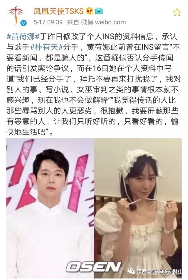 果不其然,2018年4月,陆续传出二人已经分手的传闻,5月15日,朴有天的经纪公司确认朴有天与未婚妻黄荷娜最终分手,称黄荷娜会继续以粉丝身份为朴有天进行应援。