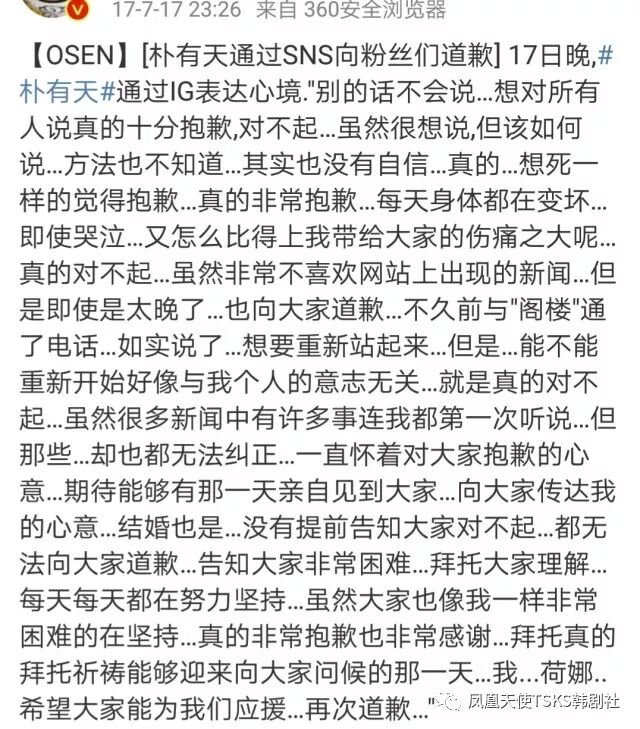 朴有天为了安慰粉丝,2017年7月17日,通过ins对粉丝表达了自己的歉意,希望能得到理解。