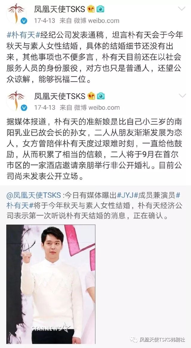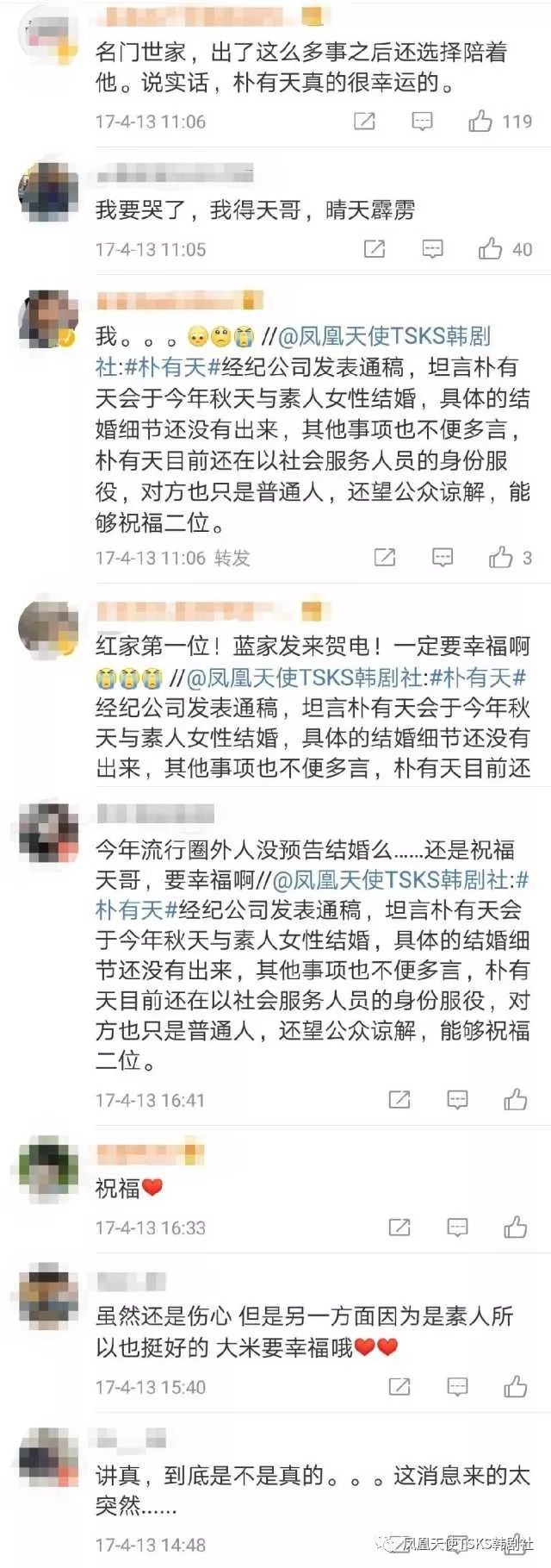 婚讯传出突然,粉丝们虽然震惊,但想到朴有天经过诬告一事,精神上受到巨大的创伤,回归平淡结婚生子也许是帮助欧巴抚平伤痕、度过低谷的最好方式。因而,当时的粉丝路人大多是抱着温暖的祝福态度,希望二人能相互陪伴,一起度过艰难时光。