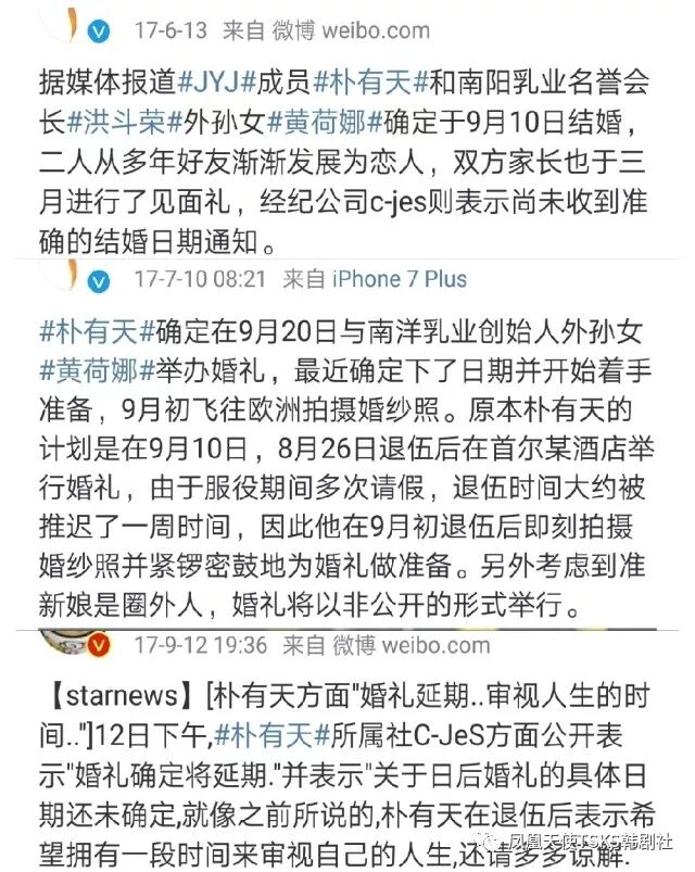 所以,你以为在恋情公开风波之后婚事就这样确认了吗?Too young too simple!从公布婚讯开始,婚期和婚礼地点就一直变动,原定于2017年9月10日举办的婚礼,先是考虑到朴有天退伍时间因此将婚礼推延至9月20日。原定于首尔举行的婚礼地点也变得未知。