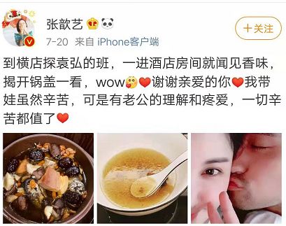 到横店探班袁弘的张歆艺,一进酒店房间就闻见香味,原来袁弘早就为她煲好了汤。