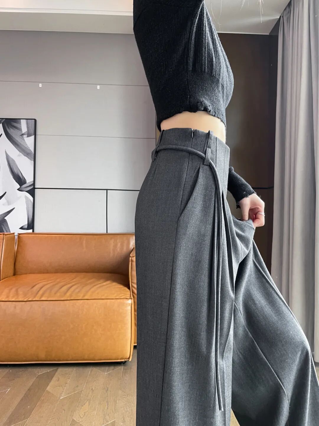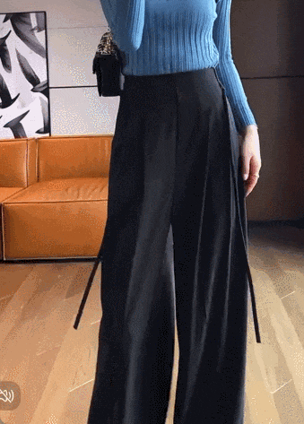 最妙的还是这条裤子腰部以下的褶皱设计,拉伸纵向比例,视觉更显腿长显瘦,同时呢, 也让整条裤子更立体,垂感更强,走路更带风。