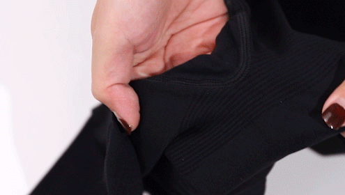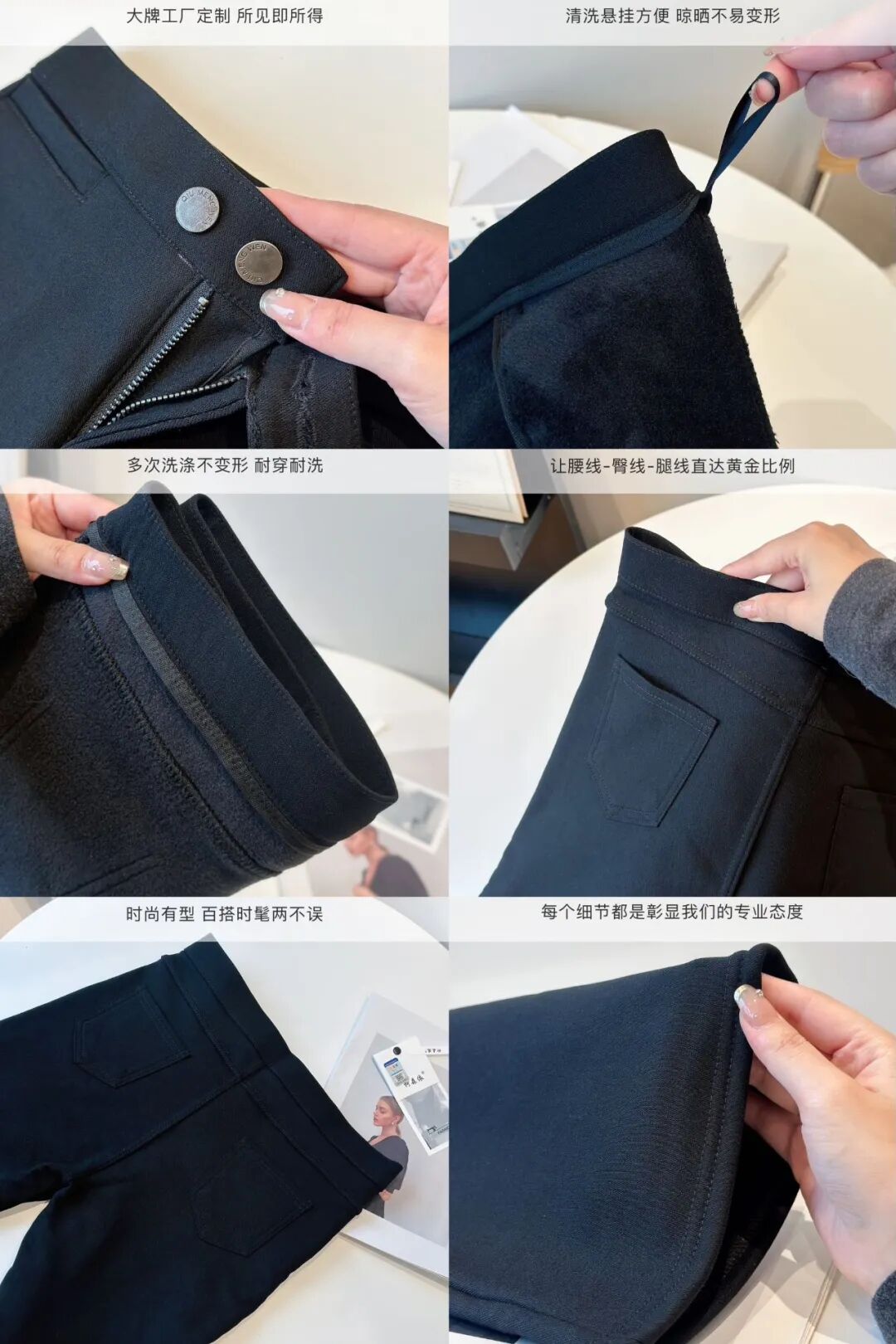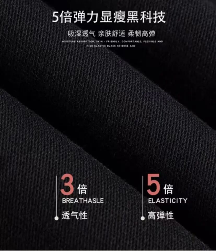 整体版型干净利落,剪裁立体合身,可以牢牢包裹双腿,视觉显瘦,再加上标准深黑色系,视觉更显瘦!