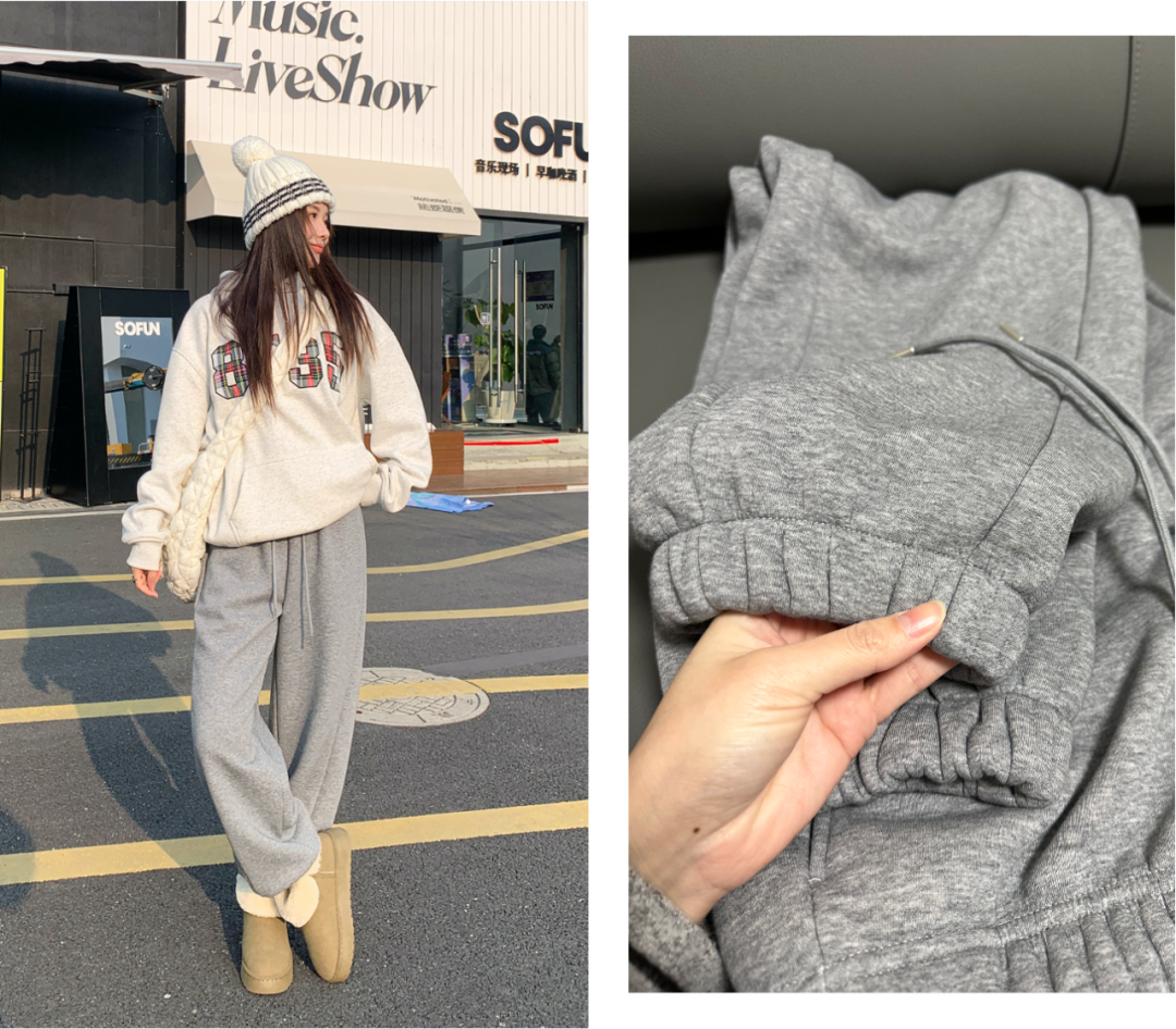 外层是高克重双纱卫衣面料,含棉量很高,比普通裤子更耐磨、不易起球、不易变形。