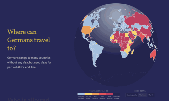 有时,数据可视化非常有用。比如这份关于旅游签证不平等的图表。在从泰国旅行归来后,Christian Laesser创建了这幅图表,想了解不同国家的在旅游签证上不同的优势。在这篇可交互的图表上,用户可以点击某一国家以了解该国家的国民是否需要签证以访问其他国家,以及其他国家国民是否需要签证以访问该国家。