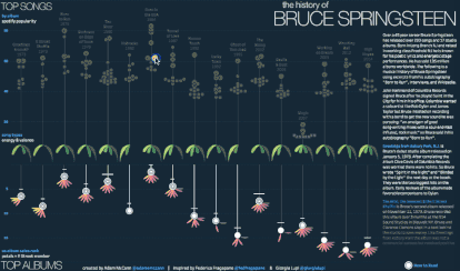 Adam McCann创作的可视化作品展示了Bruce Springsteen迄今为止录制的每一首歌。根据Spotify以及其他来源的数据,他展现了Bruce Springsteen的每一首歌的每一个细节。这些专辑和单曲是按照流行度的排名组织的,每一个设计细节都代表着专辑的一个方面。图表的主题是带有种子、树叶、花瓣等植物元素的怀旧风格。为了便于理解,图表中还有一个“How to read”的可点击按钮。