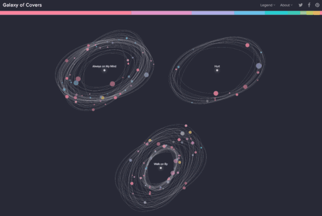 这项关于著名歌曲封面的可爱的交互式数据可视化作品给出了满意的答案。每支单曲都是一颗行星,其封面则是绕着它旋转的卫星。我们可以点击每一首歌的行星来观察它的相关数据。该数据可视化由Interactive Things团队创建,超级酷哦。