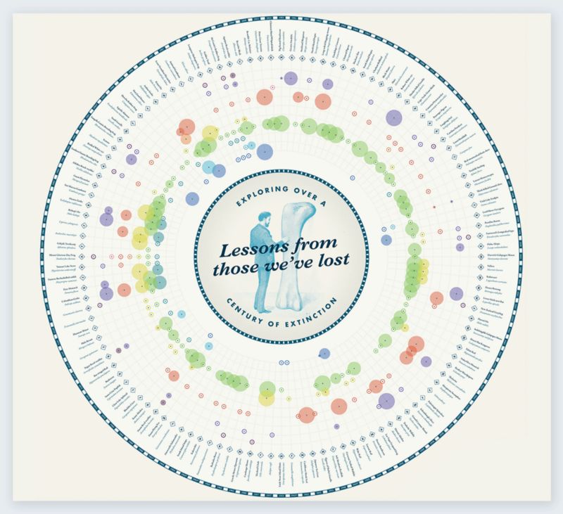 这是设计师James Round另一幅酷炫的数据可视化。这一次他关注百年间灭绝物种的数据,以分析他们如何、何时以及为什么灭绝的。通过这些数据分析,也许我们可以学到如何在未来拯救濒临灭绝的生物。