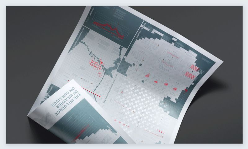 Clever & Franke是一家数据设计公司,在荷兰与美国从事数据分析与设计工作。CF天气图使他们最喜欢的独立项目之一。最新的第五版于今年早些时候问世,它关于天气如何影响我们的情绪状态。这个项目收集了关于天气模式以及人们在一年中不同时间行为的大量数据,并进行相关性数据分析。它包含了大约60个可视化部分。最终成品作为印制海报出售。