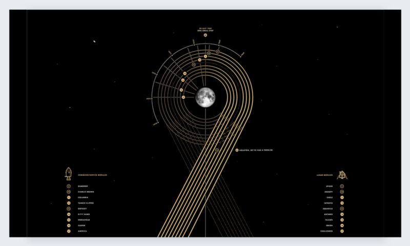 Paul Button是一名美术设计师,他喜欢分析数据,然后以一种美妙的方式展示这些数据。他对包括Apollo计划在内的一切太空相关的东西都非常感兴趣。利用收集到的Apollo计划中每一次任务的数据,他创作了这幅可视化图表。他把这幅图表制作成艺术印刷品出售并且相当畅销。Paul Button绘制的这幅Apollo图表品质极高,不仅针对那些太空探索的爱好者,也针对所有数据迷。