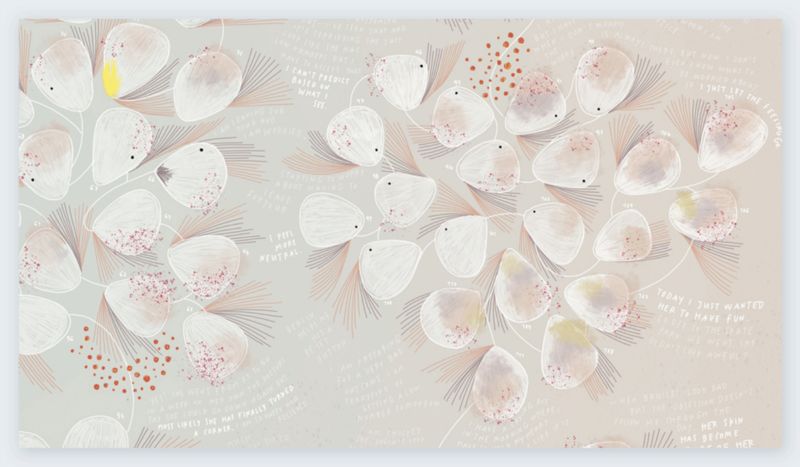她使用的数据集来自Elijah Meeks开展的一项调查的结果,这项调查是关于数据可视化领域的女性工作者的。Alli Torban设计的这个图表将个人感受和数据结合在一起,也让她对自己工作内容有了更深刻的体会。