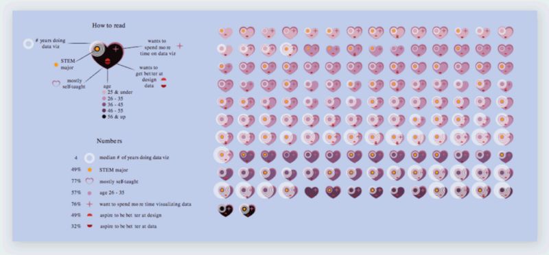 来自Data Visualization Today的Alli Torban受到上面我们提到的选择正确睫毛膏的示例的启发,采用了睫毛膏可视化图表眼状图标类似的风格,不过她使用的是心形图案。