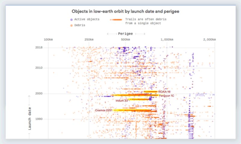 Axios的数据团队使用美国军方联合太空作战中心的数据创建了这一可视化项目。根据他们的数据,在低地球轨道中有超过13000件太空垃圾。即使这个数字已经很惊人了,由于尺寸以及其他很多因素许多垃圾都没有被登记在卫星上,这个数据其实并不完整。联合空间行动中心希望获得有关其他空间碎片的信息,以便参与太空探索的每个人都了解太空垃圾的危险性。