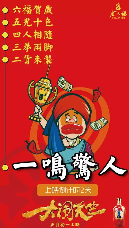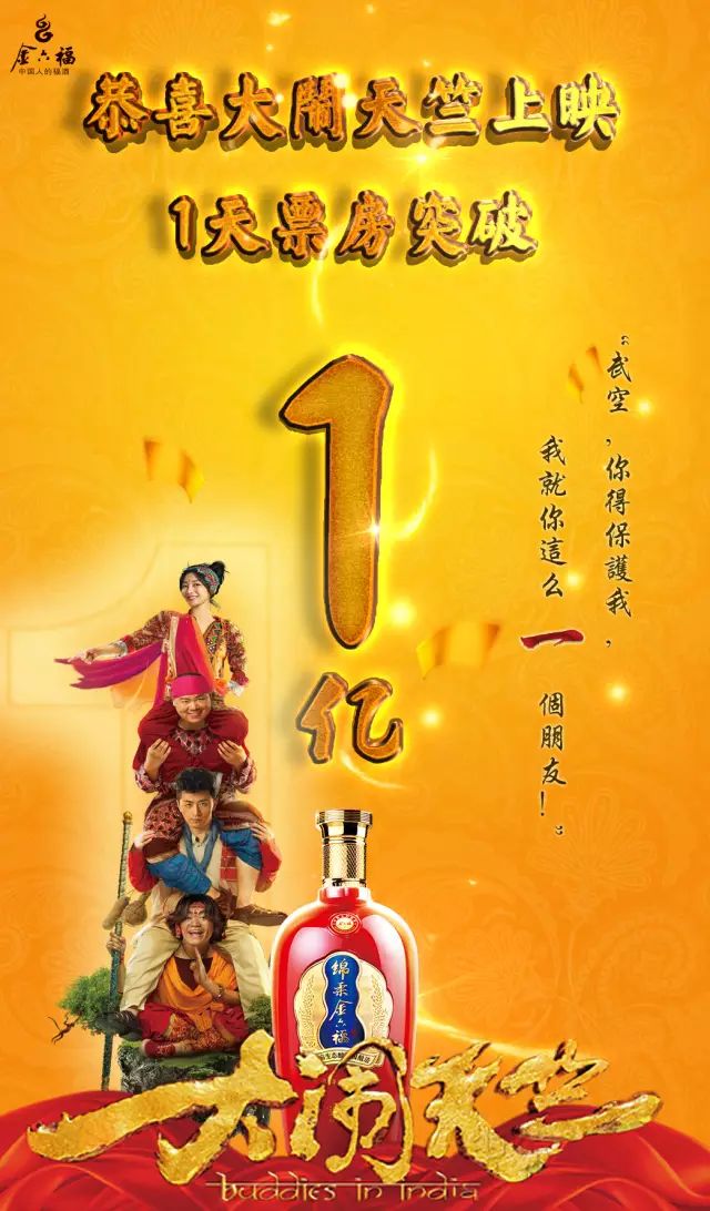 电影上映前后,金六福酒打造了一系列的创意海报,从主演阵容公布、上映倒计时,到票房破一亿、两亿、五亿、七亿等重要时刻,通过精准的文案定位及符合《大闹天竺》电影的画面风格,营造了电影在春节期间上映的喜庆气氛,也将金六福酒配合电影上映宣传量身打造的“大闹天竺一起走,带上福酒过大年”的公关宣传主题体现的淋漓尽致。获得了大量粉丝的关注。