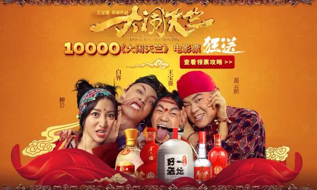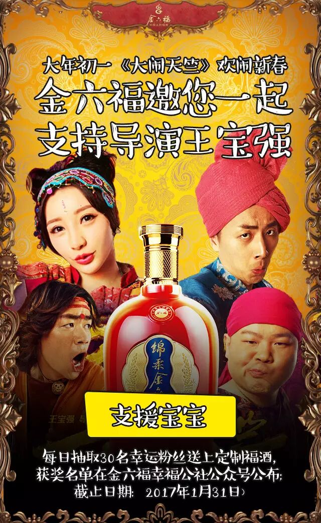 1月28日大年初一,王宝强执导的喜剧大片《大闹天竺》正式登录全国院线爆笑开年。作为王宝强自导自演的首部电影作品,《大闹天竺》延续了王宝强一直以来的功夫喜剧风格,在《西游伏妖篇》、《功夫瑜伽》等一众贺岁大片中抢得一席之地。上映当天,票房过两亿;上映两周,票房过七亿。虽然后期由于口碑分化严重导致票房增长乏力,但上映前超高的期待、超火爆的影票预售,已经让众多植入品牌赚足了关注。这其中,尤以宝强的老朋友——金六福酒最为引人瞩目。
