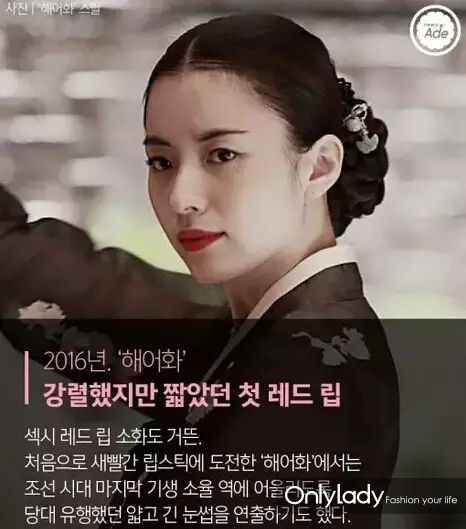 连性感的大红唇也轻松消化。在首次挑战大红色唇妆的电影《解语花》中,韩孝珠饰演朝鲜时期最后一位妓生素律。为了符合角色形象,眉毛画成了当时流行的柳叶眉。特别是那耀眼的大红色唇妆,彰显了万人迷的魅力。