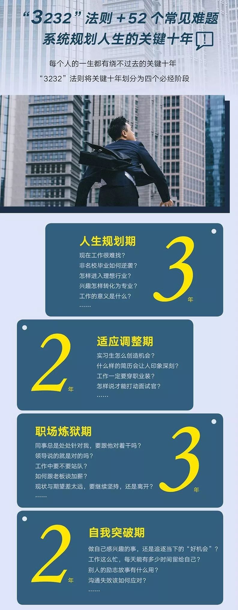 他希望通过“职场3232法则”,能够让更多初入职场的年轻人,以及一些兜兜转转还找不到方向的职场人,能够缓解焦虑,找到解决问题的方法,一步一步去解决,而不是自我怀疑,自我否定,日渐焦虑,持续消沉。