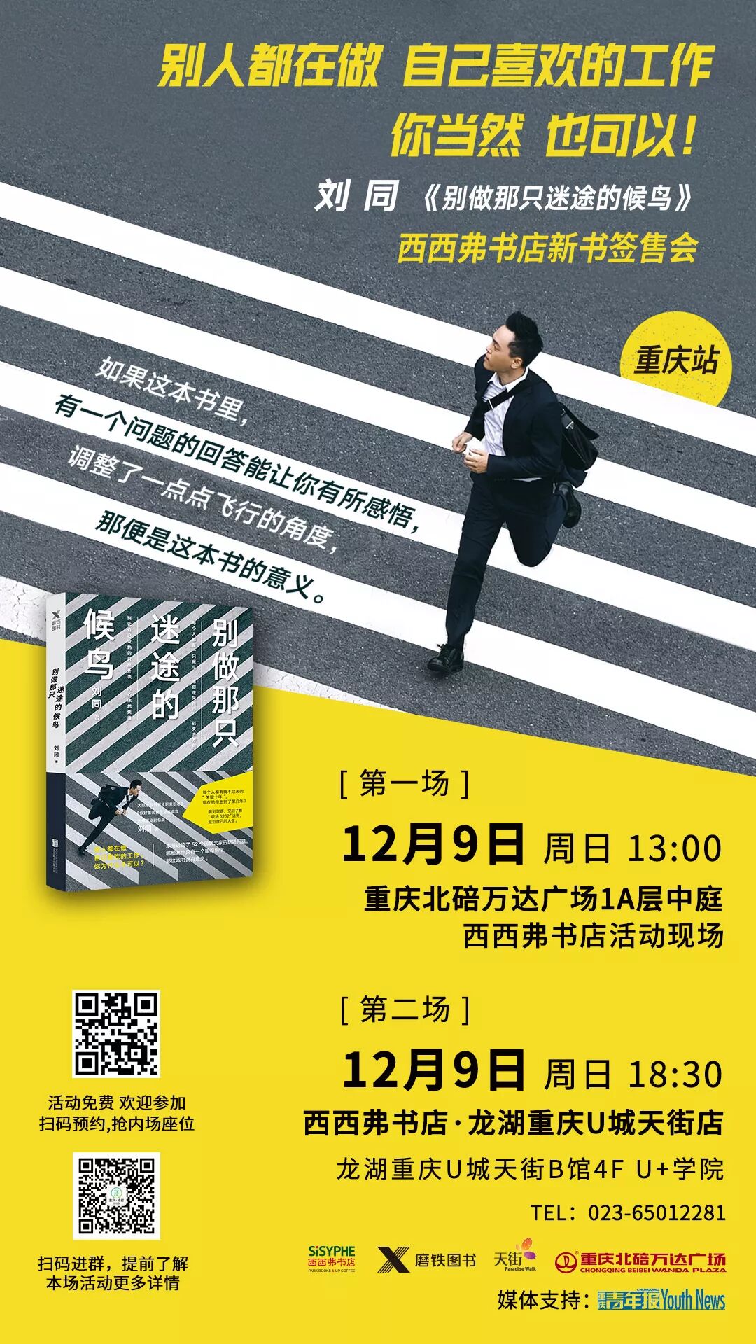 12月9日,刘同携2018全新职场硬核力作《别做那只迷途的候鸟》登陆重庆西西弗书店,一天时间,两场活动,让你看到同哥在职场上、工作中笃定而毫不犹豫的理性面貌。