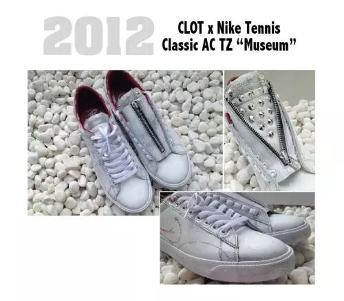 CLOT x Nike Tennis Classic Suede "Museum" 的台湾限定版本,由 Hollywood Heartbreaker 团队负责设计打造,首先运用白色油漆将鞋款完全重新覆盖,再加入钻孔破坏、斑驳做旧、改装铆钉以及拉链等元素,其中双脚不对称的设计更是颠覆传统的想法,犹如一件艺术作品。