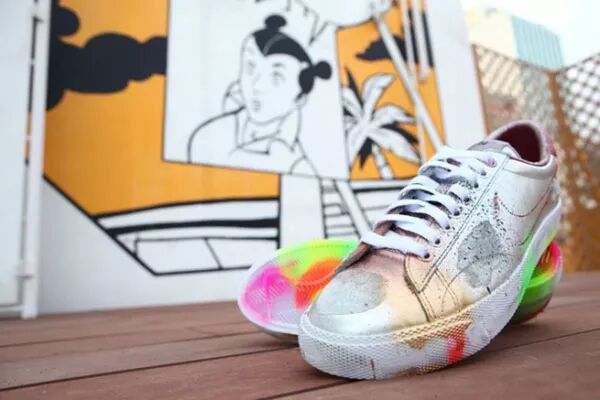 以 CLOT x Nike Tennis Classic Suede " Museum " 为蓝本而推出的改造鞋款,此款版本的每一双均由 MC YAN 亲自涂鸦设计,而最大的亮点在于鞋头的夜光喷漆 CLOT Logo 。