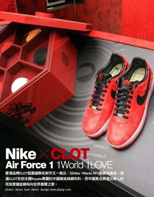 设计上,延续了中国风的设计元素,并采用了创新性的双层鞋面,表面红色的丝绸材质为 CLOT 独有的中国古典花纹设计,但撕开表层后,内里则为镭射图案的皮革鞋面,其中为配合当时农历新年的发售时间,还特别附带了中式糖果盒包装,收藏意义无与伦比!