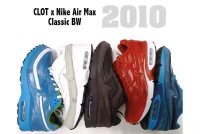 2010 年 CLOT 成立六周年之际,与 Nike 携手推出了 CLOT x Nike Air Max Classic BW 系列鞋款,一共推出 5 个配色;在设计上,除了鞋侧有用镭射雕刻上 CLOT Logo 外,还在鞋舌上绣了罗马数字 "VI" 代表 6 周年,其中每色只生产 6 双为 CLOT 内部工作人员专享,并未对外公开发售!