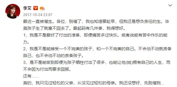 其实去年,李艾就一直被催生,还发曾微博表示,别催了,她知道要趁早,但她还是想负责任的生,毕竟孩子生了就塞不回去了。