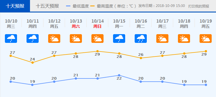预计今日至11日冷空气南下,配合高空槽和弱切变线影响,云量增多,有阵雨,白天气温下降明显,日温差减小,最低气温下降至19℃左右。天气变凉,需注意适时增减衣物,外出时请携带雨伞。