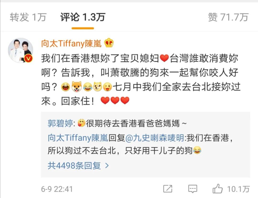 1、郭碧婷在台北,向家人都在香港,她说的另有其人其事。 2、警告所谓的“身边人” 别欺负她,不只在香港,台北我们也有人。 3、喊话干儿子萧敬腾帮忙在台湾照看着点。 4、告诉大家我们感情没有问题,只是暂时没在一起。 5,七月中旬我们全家去接人,我们都是一家人。