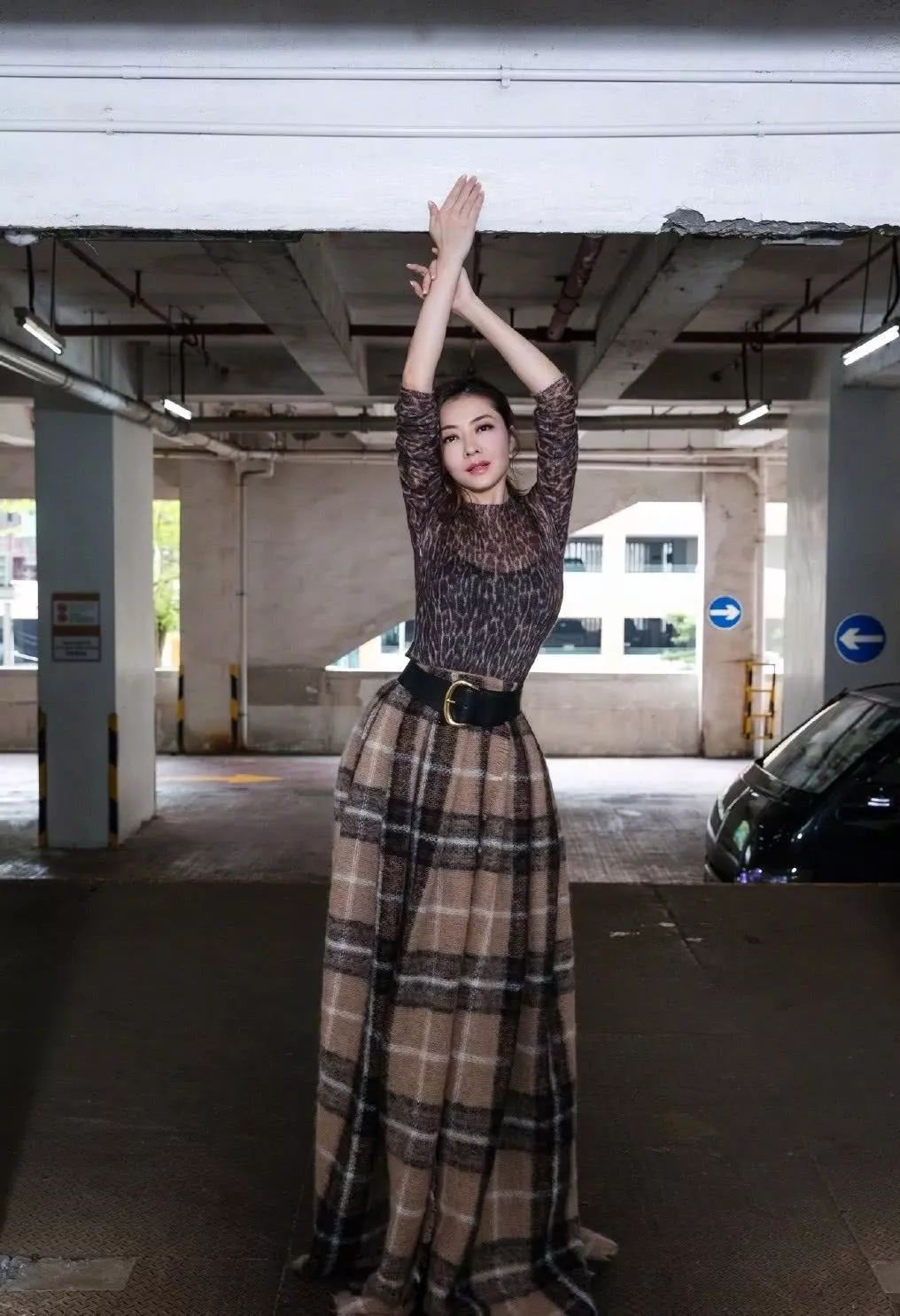 不得不说熊黛林的身材是真的好,不然也不能当模特,生完小孩不久就穿着抹胸黑色打底衣外面穿件貂皮透视长袖,看起来真性感,再看她下面穿的格子长裙,这不就是我们平时用的"围巾"嘛?