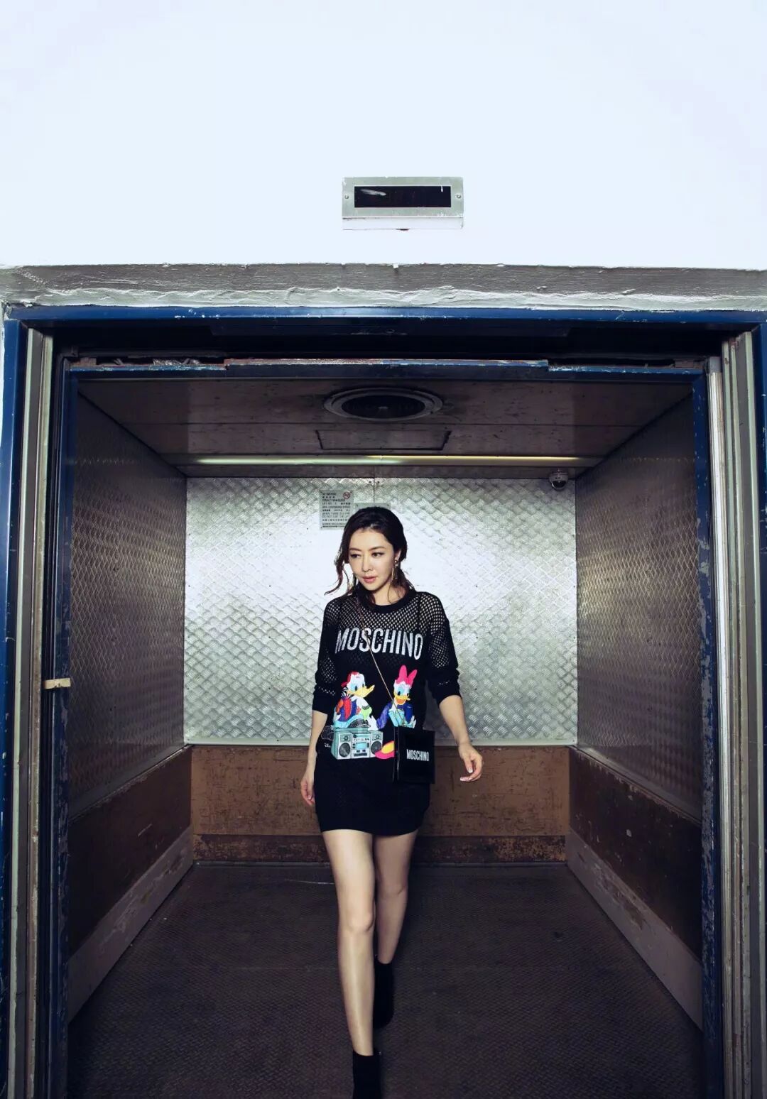 再看这条裙子,整体以黑色为主,里面还穿了件白色短袖,胸以上采用了网状设计,看起来又性感又时尚,还有裙子面前那唐老鸭图案真可爱,真不愧是生了娃的辣妈。