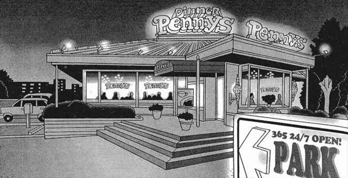 漫画中 SARU 族群平时聚会的地点 Penny’s 餐厅的原型是美国连锁餐厅 Denny’s,简单的灰黑线条勾勒东京安静的夜(图片来源:Google)
