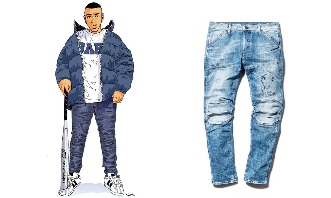 2016 年 G-Star RAW 与井上三太合作在东京举办画展,同时也展示其手绘漫画人物阿海的 G-Star Elwood 裤款(图片来源:houyhnhnm)