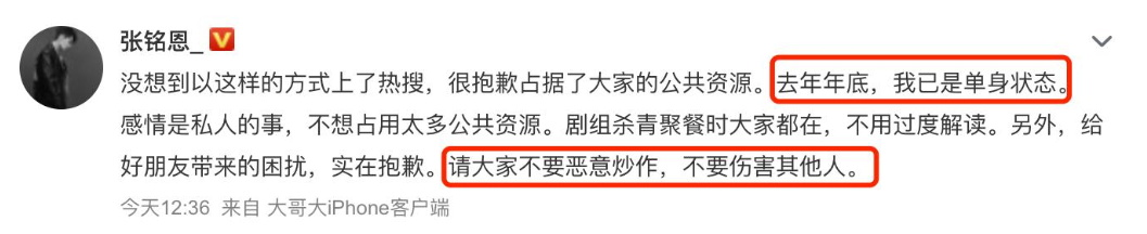 事后男主张铭恩,也在个人动态上公开澄清:与徐璐在去年年底已经分手。