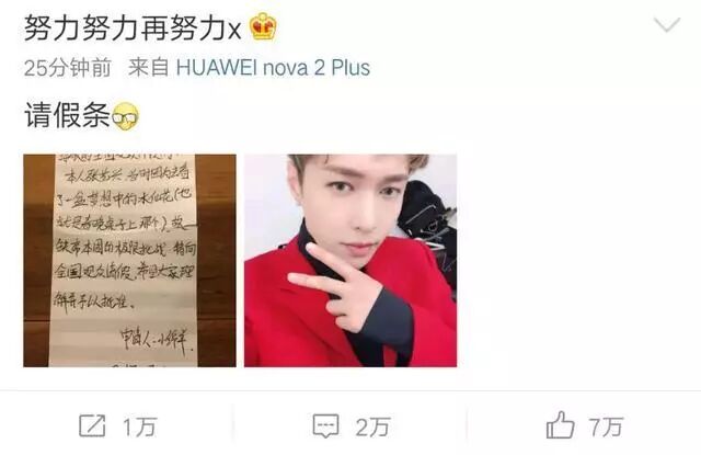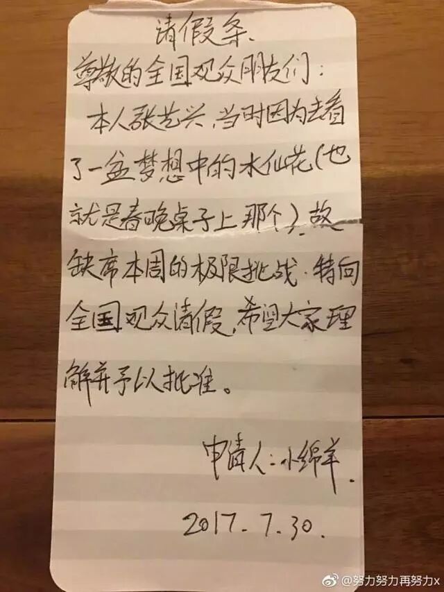 张艺兴近两年发展非常快,人气居高不下,各种资源不断。而且他参加的综艺节目《极限挑战》凭借着盛世美颜以及好人品让他受到了广大观众的欢迎。而本周的小绵羊却请假了,还在微博里PO出一张手写的请假条。