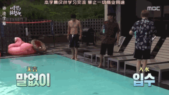 李尚禹宛如父亲一般,伟岸地把水上排球的网子给拽了下来,宅男们才开始打起了(技术很差的)水上排球赛。