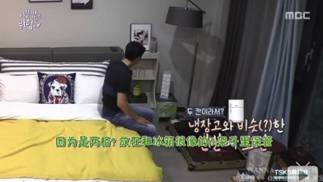 李尚禹去厕所找冰箱未果,干脆把需要冷藏的咖啡放在了床头柜上。
