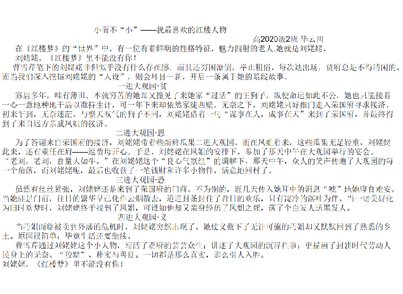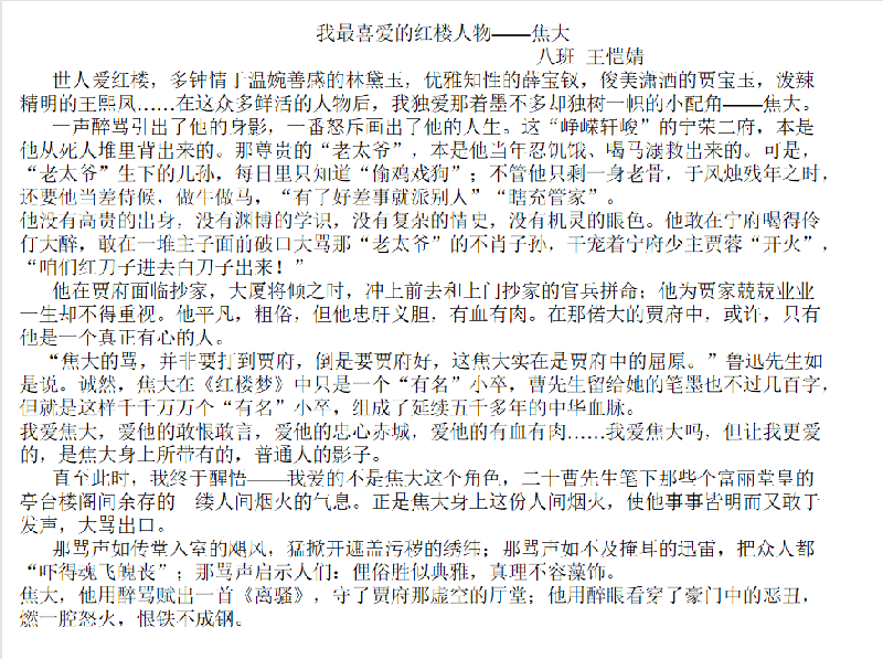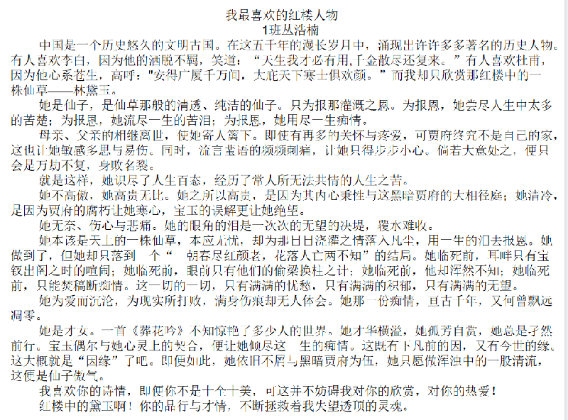 我最喜欢的红楼人物优秀名单:丛浩楠(1)白哲远(1)范馨元(1)毕云川(2)王雨露(2)姜文政(2)郭蓁嵘(2)肖楚怡(3)刘润卿(3)满丹妮(3)范亦婷(4)车奕霖(4)刘佳璐(5)王家浠(5)韩泽羽(5)赵昱淇 (6)王一雯(6)张译文(6)李昱萱(8)李宇琛(8)任卓群(8)王恺婧(8)王少瑜(8)车欣霏(8)白雨欣(9)张继冉(9)邢伊萱(9)颜子秦(9)