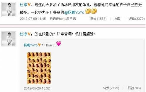 分手两个月后,杜淳在参加陈龙的婚礼时承认自己有一名圈外女友,并高调@杨璐。