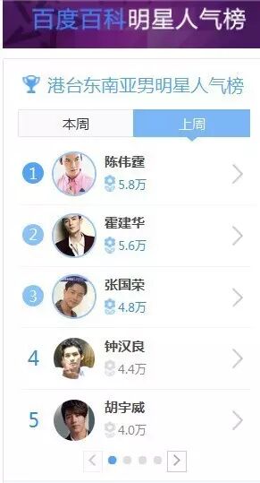 百度百科(03.28—04.03)明星人气榜,港台东南亚男明星人气榜TOP1:陈伟霆。