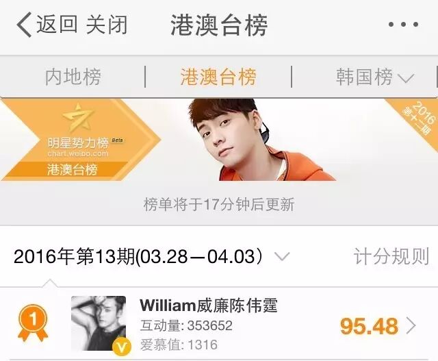 2016年第十三期(03.28—04.03)“明星势力榜”冠军出炉!港澳台榜冠军:陈伟霆!
