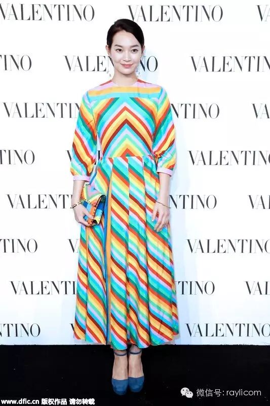 身着Valentino五彩条纹长裙,撞色款看起来颇为减龄,亮眼又时髦。